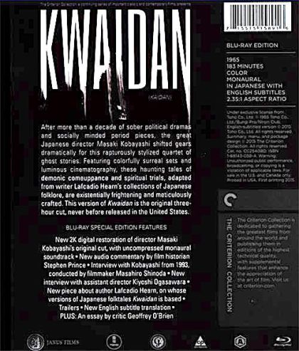 Masaki Kobayashi's stylish horror film Kwaidan comes to DVD with a widescreen anamorphic transfer that preserves the original theatrical aspect ratio of 2.35:1. The Japanese soundtrack is rendered in Dolby Digital Mono. English subtitles are accessible. Supplemental materials include the original theatrical trailer. Although there are few extras, the quality of the sound and picture on this release continue to show why Criterion is one of the best names in DVD.