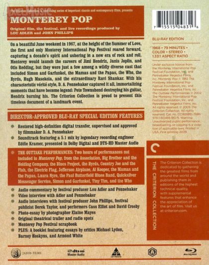 Featuring performances by popular artists of the 1960s, this concert film highlights the music of the 1967 California festival. Although not all musicians who performed at the Monterey Pop Festival are on film, some of the notable acts include the Mamas and the Papas, Simon & Garfunkel, Jefferson Airplane, the Who, Otis Redding, and the Jimi Hendrix Experience. Hendrix's post-performance antics -- lighting a guitar on fire, breaking it and tossing a part into the audience -- are captured.