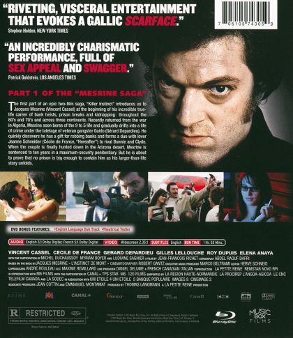 The early career (1959-’70) of outlaw Jacques Mesrine (Cassel), covering his military service in Algeria, apprenticeship with a Paris gang-lord (Depardieu), crime-spree partnership with soulmate Jeanne (De France) and escape from a tough Canadian prison.