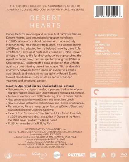 Donna Deitch’s swooning and sensual first narrative feature, Desert Hearts, was groundbreaking upon its release in 1985: a love story about two women, made entirely independently, on a shoestring budget, by a woman. In this 1959-set film, adapted from a beloved novel by Jane Rule, straitlaced East Coast professor Vivian Bell (Helen Shaver) arrives in Reno to file for divorce but winds up catching the eye of someone new, the free-spirited young Cay (Patricia Charbonneau), touching off a slow seduction that unfolds against a breathtaking desert landscape. With undeniable chemistry between its two leads, an evocative jukebox soundtrack, and vivid cinematography by Robert Elswit, Desert Hearts beautifully exudes a sense of tender yearning and emotional candor.