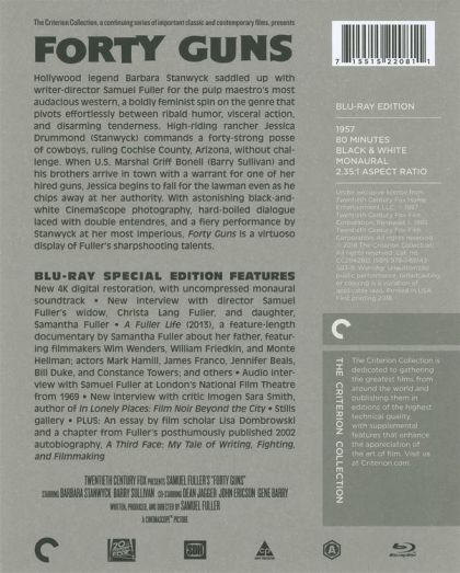 Hollywood legend Barbara Stanwyck saddled up with writer-director Samuel Fuller for the pulp maestro’s most audacious western, a boldly feminist spin on the genre that pivots effortlessly between ribald humor, visceral action, and disarming tenderness. High-riding rancher Jessica Drummond (Stanwyck) commands a forty-strong posse of cowboys, ruling Cochise County, Arizona, without challenge. When U.S. Marshal Griff Bonell (Barry Sullivan) and his brothers arrive in town with a warrant for one of her hired guns, Jessica begins to fall for the lawman even as he chips away at her authority. With astonishing black-and-white CinemaScope photography, hard-boiled dialogue laced with double entendres, and a fiery performance by Stanwyck at her most imperious, Forty Guns is a virtuoso display of Fuller’s sharpshooting talents.
