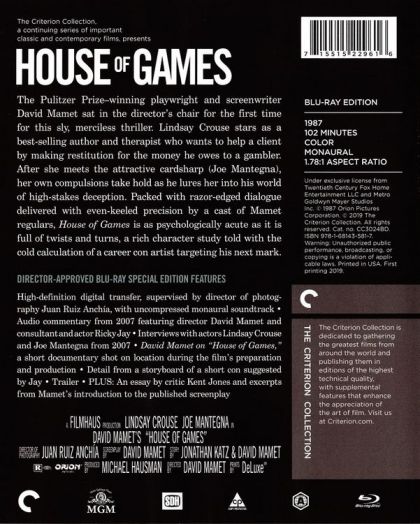 In his directorial debut, Pulitzer Prize-winning playwright David Mamet creates a stylish cinematic puzzle of games within games, as con men are joined by a psychologist in creating the perfect caper. Dr. Margaret Ford ( Lindsay Crouse ), the writer of psychological self-help books, meets Mike ( Joe Mantegna ) as she attempts to help a patient who owes heavy gambling debts. When she herself is the victim of a con, she becomes intrigued by the psychological drama of the con game and joins in a complicated scam involving a suitcase of cash. Mamet directs his extremely complicated plot with skill and complete control until it is impossible to tell who is the con and who is the victim. The suspense builds to an amazing surprise ending which is both reasonable and believable but completely unpredictable. Crouse and Mantegna are outstanding as are all the supporting performances. Mamet and his cinematographer Juan Ruiz-Anchia create a visually stunning, compelling film that does justice to Mamet 's superbly written screenplay — Linda Rasmussen