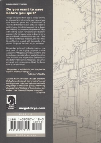 The wildly popular web comic that spawned a best selling trade paperback has found a new home! Fans and friends of the Megatokyo web comic have come to love the characters and their offbeat adventures. Whether they are entangled in a fantasy gaming scenario, saving Tokyo from devastation by rampaging zombies, or taking awkward and disaster-filled steps towards a meaningful relationship, we get to experience Tokyo through their many unique and drastically different points of view. Rife with references to video game and anime culture both here and in Japan, it is a story that contrasts the cultures, the characters, and their own perceptions of what is around them. Those new to the series may find familiar emotions and a dialogue that is eerily similar to their own. Volume 2 contains Chapter 1 and Chapter 2 of the Megatokyo webcomic, complete with miscellaneous comics, sketches and other material. Extra material exclusive to the print edition includes editorial comments by the author and a short story with illustrations from the Endgames gaming universe.