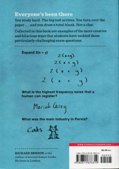 "It's instant comic relief." - Daily GlowCelebrating the creative side of failure: "F" stands for "funny" in this perfect gift for students or anyone who has ever had to struggle through a test and needs a good laugh. Celebrating the creative side of failure in a way we can all relate to, F in Exams gathers the most hilarious and inventive test answers provided by students who, faced with a question they have no hope of getting right, decide to have a little fun instead. Whether in science (Q: What is the highest frequency noise that a human can register? A: Mariah Carey), the humanities (Q: What did Mahatma Gandhi and Genghis Khan have in common? A: Unusual names), math, or other subjects, Richard Benson's book proves that while everyone enjoys the spectacle of failure, it's even sweeter to see a FAIL turn into a WIN. Contains 250 hilariously wrong test answers from exams in Chemistry, Biology, Physics, Math, Business and Technology, Psychology, History and Geography, and English. Laugh out loud funny for teachers and students alike. With the handwriting – and doodles – of the test taker, readers will have flashbacks of anxiously sitting over a test paper chewing on the end of a pencil. Fans of F for Effort and F This Test will love F in Exams...and perhaps be a little envious of the students who took full advantage of not knowing the correct answer. Celebrating the creative side of failure with 250 totally wrong test answers. A perfect coffee table, bathroom or bar top conversation-starting bookMakes a great graduation, teacher appreciation and teacher retirement gift