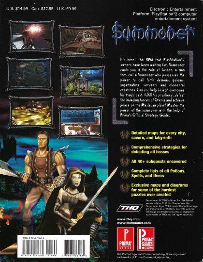 After summoning a powerful demon that destroyed his home village, Joseph wandered alone until receiving a quest to find a series of ancient rings. Joined by a thief, a lady of high society, and a victim of his past mistakes, Joseph sets out into a hostile world to achieve his quest and make peace with his own demons. It's a world you won't want to enter on your own. "Summoner: Prima's Official Strategy Guide" will hold your hand through the world of darkness, show you how to get the most out of your traveling companions, explain the mystic puzzles that cross your path, and- hopefully- enable you to command the powers of Hell, itself. Your guilty conscience, however, is your own problem. Prima's guide gives you: - Detailed maps for every city, cavern, and labyrinth- Comprehensive strategies for defeating all bosses- All 40+ subquests- Complete lists of all Potions, Spells, and Items- Exclusive maps and diagrams for some of the hardest puzzles ever created