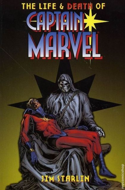 The legendary cosmic warrior called Captain Marvel was an agent of the alien Kree, humanoid beings who commanded a galaxy-spanning empire. While stationed on Earth, Mar-Vell's sympathy for the planet's people caused him to disobey a direct order. His punishment: death! Escaping execution, Mar-Veil found himself stranded in the Negative Zone, an anti-matter universe existing alongside Earth. There, he telepathically contacted Rick Jones -- previously a companion of the Incredible Hulk, the most powerful man-like creature ever to walk the Earth, and Captain America, star-spangled Sentinel of Liberty. Mar-Vell instructed the teenager to don a pair of extraterrestrial bracelets -- and when Rick slammed the golden Nega-Bands together with all his might, his atoms traded places with those of the exiled Kree. The hero materialized on Earth, while Rick was surrounded by a protective aura that allowed him to survive in the Negative Zone. Captain Marvel wielded his cosmic powers in defense of the galaxy ... and Earth, his adopted homeworld. But after many an awesome adventure and countless victories, Mar-Vell's exposure to a carcinogenic nerve gas took its toll. Ultimately, he succumbed to the one enemy he proved unable to defeat: an incurable systemic cancer. Mar-Vell died not on the field of battle, but on a sickbed -- surrounded by an awesome assemblage of adventurers, gathered to pay tribute to the legacy of their fallen friend!
