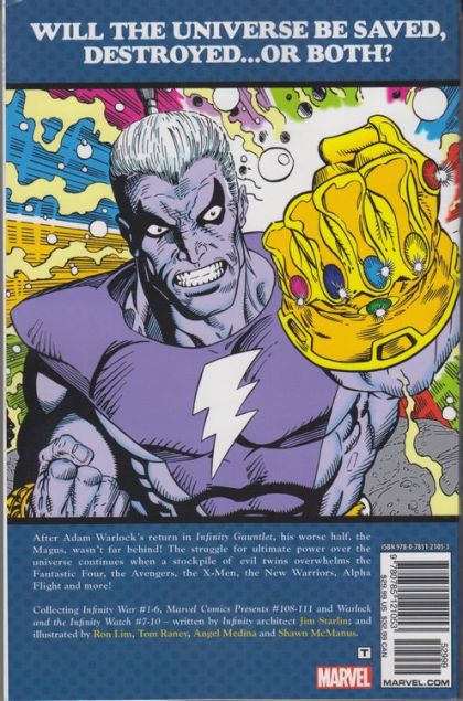 The thrilling follow-up event to the timeless classic Infinity Gauntlet, with the entire Marvel Universe at war! After Adam Warlock's return in Infinity Gauntlet, his dark half, the Magus, wasn't far behind! The struggle for ultimate power over the universe continues, and when evil doppelgangers of the Marvel heroes appear, it's all-out war! Why has Magus unleashed them on an unsuspecting world? And is the heroes only hope...Thanos?! Will the universe be saved, destroyed...or both?Plus, will the Infinity Gauntlet swing the tide of the war? COLLECTING- Infinity War #1-6, Warlock and the Infinity Watch #7-10, Marvel Comics Presents #108-111