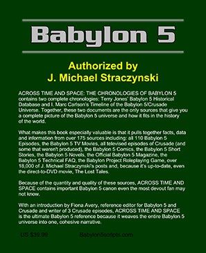 * Contains two complete Terry Jones' Babylon 5 Historical Database (parts of which were previously published in the now-defunct Official Babylon 5 magazine) and I. Marc Carlson's "Time Line of the Babylon 5/Crusade Universe."* Together these two documents are the only sources that give you a complete picture of the Babylon 5 universe and how it fits in the history of the world* Contains important Babylon 5 canon buried in the novels, comic, books and short stories.* Up to the minute -- includes "The Lost Tales".* Includes information that has not been published in a decade from out-of-print publications such as the Official B5 magazine.* The ultimate Babylon 5 reference because it weaves the entire B5 universe into a cohesive narrative.* Includes data from all televised episodes of Crusade and some that weren't even produced.* Includes an introduction by Fiona Avery, reference editor for Babylon 5 and Crusade (and writer of 3 Crusade episodes).
