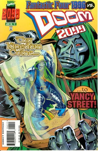 Part 3 of 4. Written by Tom DeFalco. Art by Jeff Lafferty, Harry Candelario, Karl Story, Joe Rubinstein, Vince Russell, and Scott Williams. Cover by John Buscema and Jim Palmiotti. Traveling to the present day, Doom intends to make sure his beloved Latverians survive to see the year 2099. This story is continued in Fantastic Four #413. Rage Against Time storyline part 3. 36 pages, full color. $1.95. Cover price $1.95.
