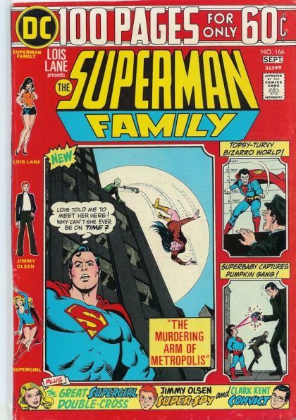 Cover art by Nick Cardy. The Murdering Arm of Metropolis, script by Cary Bates, art by John Rosenberger; When Dr. Foxley is killed, Lois Lane is an eyewitness; She is taken to SIA headquarters by Simon Cross for debriefing and the SIA chief teams her up with Simon to find the killer. Lois Lane, Undercover Agent!, script by Cary Bates, art by John Rosenberger. The Secret of Spangle's Garden, script by Cary Bates, art by John Rosenberger. Olsen's Super-Survival Kit!, script by Otto Binder, pencils by Curt Swan, inks by George Klein. The Great Supergirl Double-Cross!, script by Leo Dorfman, art by Jim Mooney. Superbaby Captures the Pumpkin Gang!, script by Leo Dorfman, art by George Papp. Lex Luthor and Clark Kent: Cell-Mates!--Private Life of Clark Kent, script by Edmond Hamilton, pencils by Curt Swan, inks by George Klein. Car 45, Get Lost!--Tales of the Bizarro World, script by Jerry Siegel, art by John Forte. Fact File on the Superman Family by E. Nelson Bridwell. 100 pgs. $0.60. Cover price $0.60.