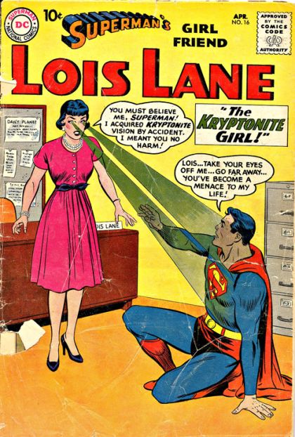 Having to meet with Superman in a short while, Lois comes up with a temporary solution: putting bandages over her eyes she takes Lucy's dog Duke out and explains to Superman that she is writing an article about what it's like to be blind. This covers things until Superman leaves and Lois then rushes off to an optometrist to see what they can do. After examining her eyes they realize that she has been endowed with Kryptonite vision much like Superman has x-ray vision, however she cannot turn hers off. In order to help her cope with this they make her a special pair of sunglasses that filter out the Kryptonite rays.