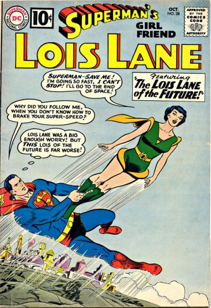 "The Lois Lane of the Future": Superman is thrown by a weapon of Lex Luthor's into an alternate 30th Century in which everyone has super-powers, thanks to gases emanating from a strange planetoid that struck Earth in 2441. He meets Lois 4XR, a double for Lois Lane, and both of them wonder if she could be the descendant of a married Superman and Lois Lane. A crumbling Daily Planet front page seems to indicate such, but, when Superman returns to the 20th Century, he learns that the newspaper was just reporting that he and Lois Lane attended the wedding of two Planet reporters.