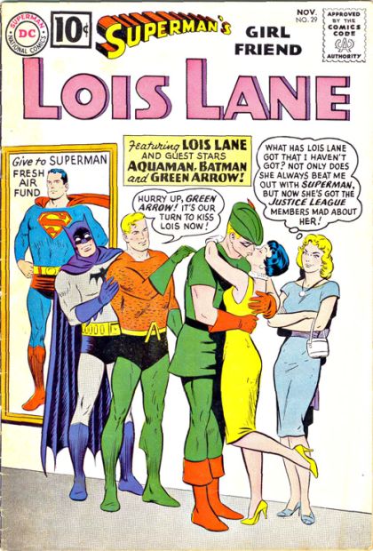 "The Irresistible Lois Lane": Aliens capture Superman in a Green Kryptonite trap, and Lois Lane smuggles Red Kryptonite to him by kissing Aquaman, Batman, and Green Arrow with Red K-imprinted lipstick. The heroes smear the lipstick from their face to handkerchiefs, which Batman takes to Superman, at the Fortress of Solitude. The Man of Steel smears himself with the Red K, which makes him impervious to Kryptonite poisoning, and allows him to recover and defeat the aliens. Afterwards, Superman gives Lois a well deserved kiss after their plan was a total success.