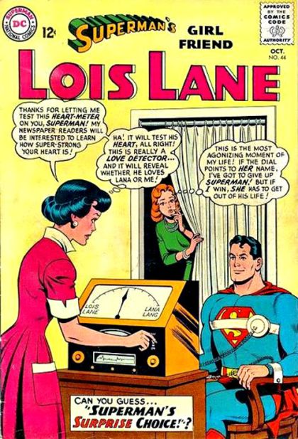 "Superman's Surprise Choice!": A device of Professor Potter's which can measure the degree of love a person holds for another seems to indicate that Superman loves Lana more than Lois, and Lois leaves Metropolis as a result.