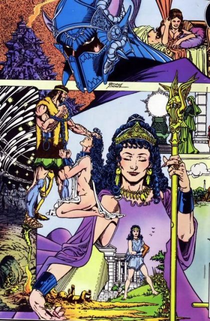 Artemis, Athena, Demeter, Hestia and Aphrodite create the Amazons to lead mankind in peace and in worship of the old gods. Ares, wanting to rule the gods and mankind, tricks Heracles into going to Themyscria to destroy the Amazons. Heracles and his army decieve the Amazons and kill, capture and rape the Amazons. While chained, Hippolyte prays to Athena who gives the queen the wisdom to escape as long as she and the amazons rededicate themselves to Gaea's way, the way of peace, and not give into vengeance. Hippolyte frees the amazons, and try's to lead them away, but they want revenge and proceed to slaughter their captors. After the slaughter, Antiope leads her followers away, vowing to not follow the gods of Olympus. Hippolyte and the rest of the Amazons are sent to Paradise Island where they must guard a great evil forever as penance for the slaughter. On Pardise Island, they build their city anew. Hippolyte, yearning for motherhood, is commanded by Athena to mold an image of a baby out of clay and then is born Diana. Princess Diana grows into a young woman and wants to compete in the contest. The contest is to choose a champion to battle Ares in the world of man. Hippolyte forbids her to enter, for fear of losing Diana. But Diana enters anyway and wins the contest and becomes the champion of the Amazons.