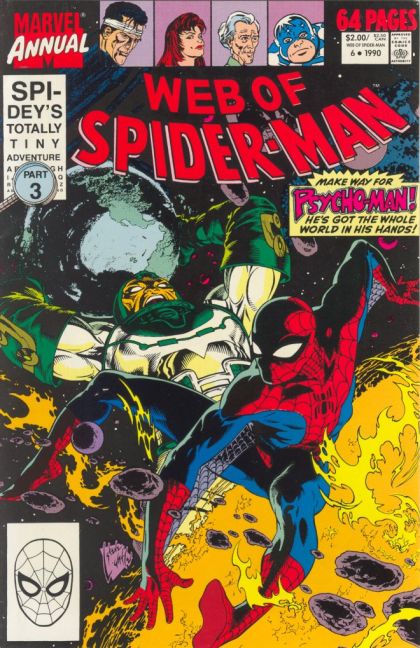 "Up From Slavery" Part 3 of the Spidey's Totally Tiny Adventure storyline. Story by Gerry Conway and Stan Lee. Art by Gil Kane, Sal Buscema, Alan Kupperberg, and Mike Esposito. Cover by Steve Lightle. In Spectacular Spiderman Annual 10, the web-slinger continued to shrink all the way down to the Microverse and became a captive of Psycho-Man. Now can the Amazing Spider-Man lead a prisoner's revolt on Psycho-Man's worldship and gain his freedom? It's a great one-on-one battle between Spider-Man and Psycho-Man! First back up story: "Salesday for a Shootout" Story by Gerry Conway. Art by Ross Andru and Mike Esposito. Mary Jane and Aunt May are shopping at the mall when terrorists attack! It's a very unlikely pairing as Aunt May teams up with the Punisher to save the day. Second back up story: "Eleven Angry Men And One Angry Woman" Story by Peter David. Art by June Brigman and Stan Drake. Mary Jane is the last holdout on a 12-person jury deliberating over a jewelry store heist. Third back up story: "Child Star" Story by Tony Isabella. Art by Steve Ditko. A small child receives the Uni-Power of Captain Universe. 64 pages Cover price $2.00.