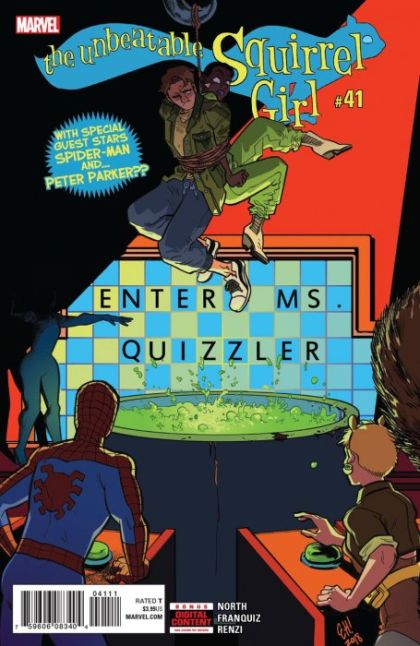 • In the past months, Squirrel Girl has battled Kraven, rescued NYC from supernatural silence, kinda-maybe died and also fought Skrulls! So now it's time for a nice break...which is why in THIS issue, Squirrel Girl does nothing but watch public domain movies on television! • That's right! She just sits there! You can kinda see the TV screen over her shoulder in a couple of panels, but that's it! It's really quiet and relaxing and nothing much happens. • ... • ...THAT IS, UNTIL NANCY WHITEHEAD AND ANOTHER ESU STUDENT BY THE NAME OF PETER PARKER ARE TAKEN HOSTAGE BY A SUPER VILLAIN INTENT ON PROVING THAT SHE'S THE SMARTEST PERSON ON THE PLANET! • Then it's super hero battles featuring THOR and SHE-HULK on a DATE! SQUIRREL GIRL matching wits against MS. QUIZZLER! And MORE! • Artist Naomi Franquiz makes her MARVEL DEBUT in a stanalone adventure you won't want to miss! Rated T