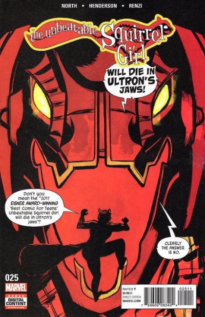 • This is it! The climactic showdown between SQUIRREL GIRL, a woman who can talk to squirrels, and ULTRON HIMSELF, a killer robot who has ruthlessly defeated the Avengers on multiple occasions! • And you may be thinking, "Holy crap I'M SOLD," but let me tell you more: This entire battle takes place in the Savage Land, an area FILLED with dinosaurs! • And NOW you may be thinking, "I'm so sold, good grief, just let me read this comic already," but hold on some more, because there's one more thing we need to tell you: ULTRON IS A TYRANNOSAURUS REX NOW. • It's Doreen Green versus DINOSAUR ROBOT ULTRON, and Kraven the Hunter is there, too! • Kraven is not a dinosaur, though. • Man, we really should've made Kraven a dinosaur, too! • Lesson learned for next time, I guess! Rated T