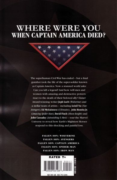 In a state funeral, Steve Rodgers is laid to rest. In a ceremony normally reserved for the death of a President, his casket is drawn to Arlington Cemetary by a single white horse with no rider. Sam Wilson delivers an elegant eulogy for the deceased hero, as the eyes of the nation look on. Later, at a private ceremony attended only by the founding Avengers who were able to make it, Captain America's body was returned to the icy waters from which Namor removed it years ago. Despite the tensions between Atlantis and the US, Namor pledges that as long as he rules beneath the seas, Steve Rodgers rest will be undisturbed.