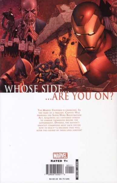 The New Warriors, filming the latest episode of their reality TV series, attack Coldheart, Cobalt Man, Speedfreek and Nitro in their Stamford, Connecticut hideout. During the battle, Nitro chooses to explode very near an elementary school. Hundreds of innocents die, including many children. Superheroes come from abroad to help with the cleanup, but this final straw pushes the Superhuman Registration Act to the forefront on the governmental agenda. The superhuman community is divided on their stance, some siding with Iron Man in support of the law, and others siding with Captain America against it.