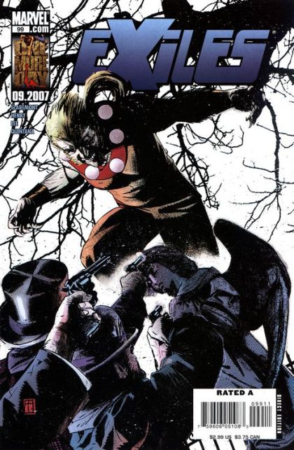 When the collapse of the last planet happened, the shockwave split the Exiles up over the Omniverse and fried the scanners in the Crystal Palace, making reassembling the team a daunting task. Sabretooth finds himself thwarting a platoon of soldiers looking to assassinate Rafael- Raven Darkholme at the graveside of his wife and daughter. Thunderbird, Psylocke and Shadowcat get the equipment in the Palace working to look for the team. Spider-Man 2099 washes up on a beach and convalesces in the home of a restaurant owner, haunted by the love he lost in Gwen Stacy on the last mission. Meanwhile, The Royal Avengers catch Rogue trying to break into the Paragon Tower in New Tokyo. Morph steps in and rescues Rogue, and they make a easy getaway. Blink finds herself alone until the Woman of the Older Generation appears, who asks Blink to join them in saving the Omniverse. They return to the Crystal Palace and meet with the Man of the Older Generation, and bounce around to collect the rest of the team. They find that Spider-Man 2099 has made a life for himself where he is and has put down the costume, so they leave to go back and track down Longshot. The computer readings are thought to be impossible at first, but Sabretooth's nose confirms it - He's sleeping peacefully in another part of the Palace.