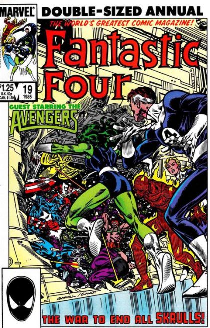 An alien in combat armour arrives on Earth, and the Fantastic Four are called to investigate. The helmet removed, the alien is revealed to be the infant terrible, last seen way, way back in issue 24. His homeworld is under attack by the Skrulls, and the Fantastic Four pitch in. However, when they arrive at Elan, the Infant Terrible is revealed to be a Skrull. Reed, however, had already deduced this, and hypnotized him into trading places, allowing Reed to take out the local Skrull vying for the role of Empress. They then proceed to the power asteroid, and break in, where they hook up with the Avengers, as depicted in Avengers Annual 14. (In fact, the same pencilled pages and scripts were used for the final portions of both annuals.) The Hyperwave bomb is detonated, and all Skrulls are locked into their current forms.