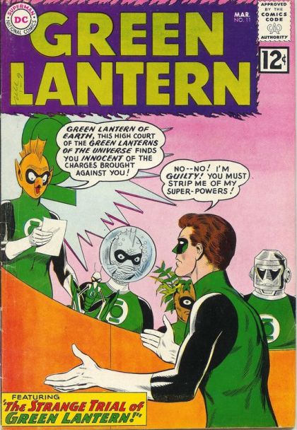 "The Strange Trial of Green Lantern" - Hal has been brought up on charges at an internal inquiry. Lately he has been neglecting his duties, or almost performing evil acts. He requests a guilty verdict, is stripped of his ring and is banished to Qward. Only after arriving there does he learn the true cause for his mental lapses.