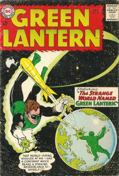"The Strange World Named Green Lantern" - Hal is returning home from a mission in space when a nearby planet forms an outline of him out of one of its continents. When the planet fires yellow missiles at him, Hal flies down to investigate properly, and finds something very unexpected.