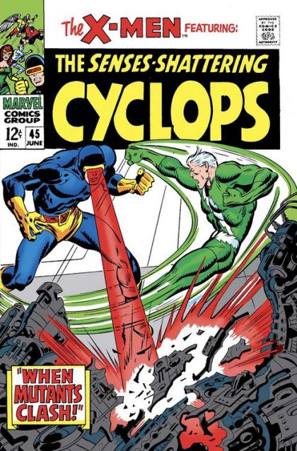 When Mutants Clash - Cyclops has managed to escape Magneto's trap, but now he needs the help of the other X-Men to halt Magneto's plan. Before he can free them, he is spotted by Toad and Quicksilver, and is forced to defend himself against the assault of the meteoric former Avenger. (Continued in Avengers, Vol. 1 #53.)