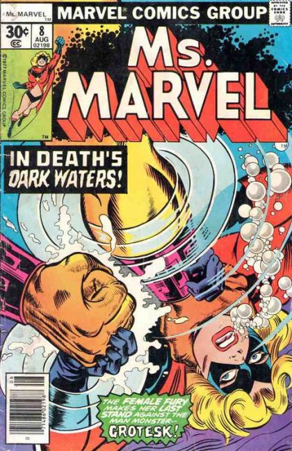 That Saturday, Carol and Michael Bennett go swimming at the beach when Carol is drawn to a research facility. Changing into Ms. Marvel once more, she finds Grotesk there attempting to utilize the Cavorite crystal on a warp generator. The two get into a lengthy battle in which Grotesk overpowers her and attempts to drown her. However, Ms. Marvel manages to get the upper hand and during their fight, Grotesk is thrown into the warp device, seemingly destroying him.