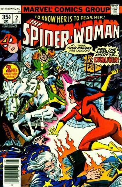 Later, as Jessica Drew, Spider-Woman attempts to find employment with minimual success. Walking the streets of London she is drawn into the shop of Charles Magnus, who promises to read her fortune for free. He tells her that he sees a great destiny in store for her. Meanwhile, Mordan le Fay causes Struthers to transform into Excalibur once more and sends him on a rampage towards Magnus' shop to destroy a book of spells. This attracts the attention of SHIELD agent Jerry Hunt, and Jessica Drew, who goes into action as Spider-Woman. She battles Excalibur and manages to defeat him, knocking the sword from his hand and causing Excalibur to revert back into Struthers.