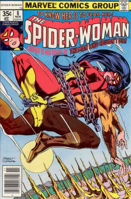 "The Man Who Could Not Die!": While out with Jerry Hunt, Jessica Drew witnesses a man trying to kill himself by falling from a fatal height. Changing into Spider-Woman, she saves the man, who flees the scene, upset that she tried to stop him. Following after him as he rides off on his motorcycle, she is shocked to find that he survives its subsequent crash, even when the motorcycle bursts into flames. Jessica is soon captured by the man, who reveals himself to be Samuel Davis. Davis has been condemned to live forever thanks to showing cowardice during the War of Independence after his entire unit was killed. Since then he has been trying to die, and each time he has found the curse to be true.