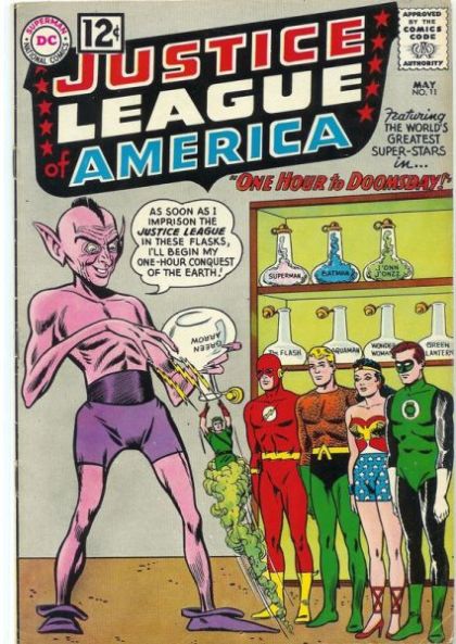 Having captured Felix Faust, the League attempt to capture the Lord of Time who taunts them before vanishing into the future. Superman takes everyone into the future where they aprehend the Lord of Time but, when trying to return him to the future, find their way blocked. The barrier was constructed by the Demons Three who had freed themselves and imprison the League but thanks to Green Lantern they manage to escape. Using his ring, Lantern disguises the other Leaguers as each other before they attack the Demons and imprison them again. They then return to the present with the Lord of Time.