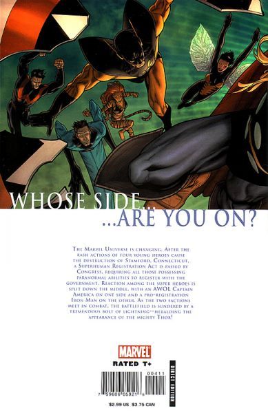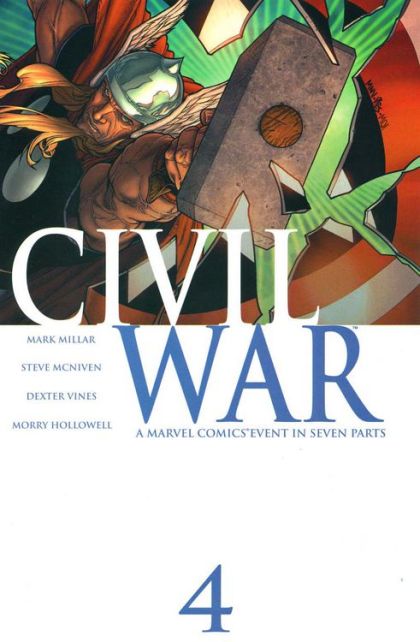 Captain America's anti-registration forces are dealt a punishing blow as Thor has apparently joined Iron Man's forces. They are only saved by the intervention of Susan Richards, who throws up a force field to protect them from Thor's lightning after the thunder god killed Goliath in battle.Heroes are leaving both sides after the battle. Some don't have the heart to continue fighting other heroes, while others feel that perhaps they aren't on the right side of the conflict. Spider-Man is much more withdrawn than normal, and is seen almost conspiring with Mary Jane and Aunt May.But though they've lost a few heroes, Captain America's forces are growing, and he has never been more determined to put a stop to tyranny than he is to oppose Iron Man. Tony has to come up with more forces if he's going to win the Civil War... but who can he turn to when the Heroes have all chosen their sides already?