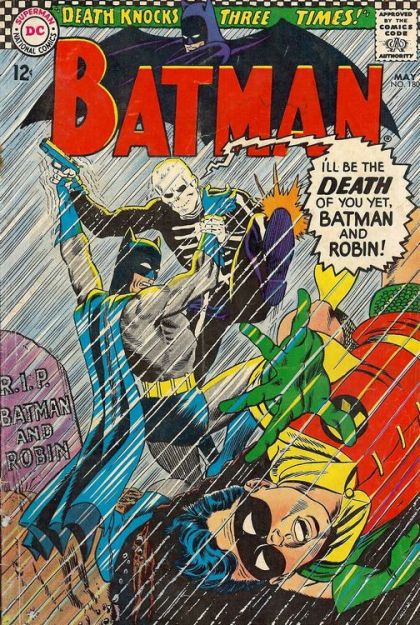 Batman and Robin pursue a new costumed criminal named Death-Man. His costume is grafted on to his body. When arrested, he drops dead, only to return again later. How can Batman punish and prosecute a man who can live and die at will?