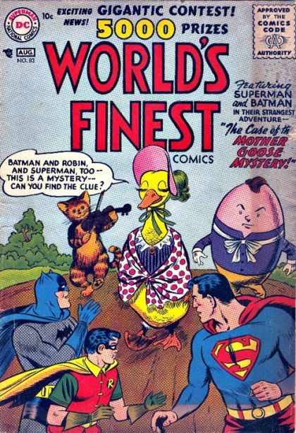 The Case of the Mother Goose Mystery - Superman, Batman and Robin are met with a man in a Humpty Dumpty costume. He gives them their first clue in a string of bizarre, Mother Goose themed mysteries.