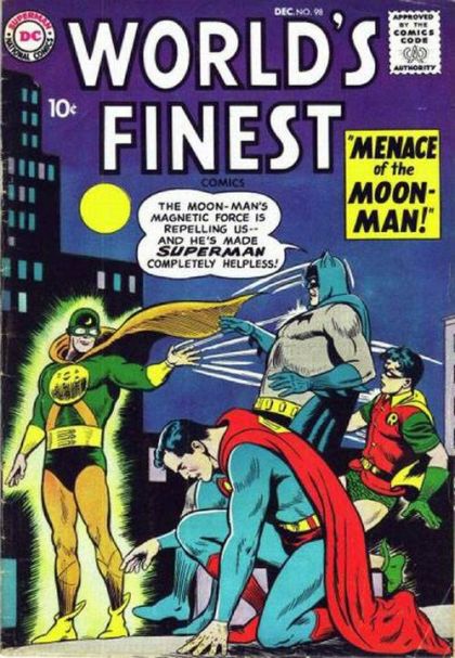The Menace of the Moonman - Superman helps the space effort by launching a manned rocket to the Moon. The astronaut inside becomes the Moonman, a kryptonite powered supercriminal able to keep Superman, Batman and Robin at bay.