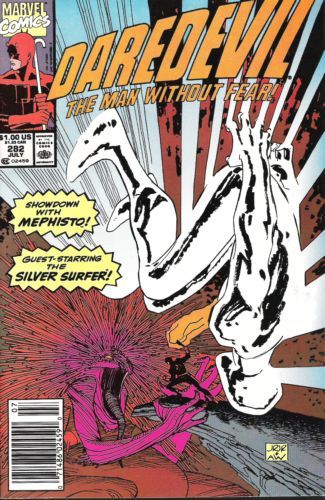 Daredevil and the others find and face Mephisto, defying him the victory he so strongly desires. The Silver Surfer arrives soon enough to cover their escape, but late enough that he is unable to save the life of Mephisto's "example."
