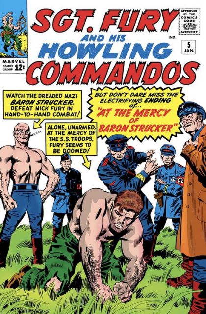 Nick Fury is taking the loss of a man last issue very hard, and has the remaining commandos going through an extra grueling training routine. Meanwhile, the German Baron Strucker has a plan for a propoganda victory, and issues a challenge to one on one fighting between himself and Fury. Fury defies orders to meet the challenges, but is drugged while Strucker's men cheat even further. Strucker wins and publishes the photos, and Fury is demoted to private, leaving Dum Dum in charge of the Howlers. They encounter Strucker once more on the road, and this time, the fight is "fair," with both men at their best, and Fury winning with almost no effort.