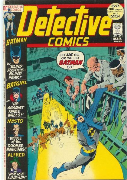 Batman must find a way of keeping a convict who has served his time alive during a prison break so that he can divulge information about corrupt politicians, despite a black militant con who wants to bargain for freedom and a hired killer out to get the man Batman wants to protect. "Up Against Three Walls!," script by Frank Robbins, art by Don Heck; Continuing from last issue... Commissioner Gordon and his daughter Barbara had traveled to Mexico City so that the Commissioner could teach the police there crime fighting techniques against drug smugglers; Arriving at police headquarters as Batgirl, Barbara learns that the local mob had demanded a ransom of twelve and a half million Pesos for their safe return.