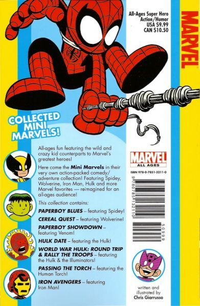 Written by CHRIS GIARRUSSO Penciled by CHRIS GIARRUSSO Cover by CHRIS GIARRUSSO Here come the Mini Marvels in their very own comedy/adventure digest! Featuring Spidey, Wolvie, Iron Man, Hulk and more Marvel favorites - reimagined for an all-ages audience! 96 PGS./All Ages ?$9.99 ISBN: 978-0-7851-3211-0 Note: This digest will have a limited print run