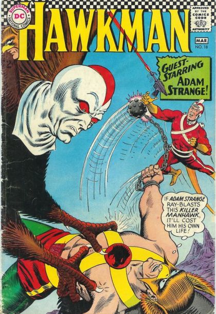 While Hawkgirl is on Thanagar, Hawkman is surprised by an emergency hyper-space call from her, warning of the escape of the Manhawks, who now threaten their world. When Katar heads home, he finds his planet missing from its normal spacial position. Meantime, on Rann, Sardath has finally found a means to keep Adam Strange on the planet, while eliminating the radiation that Kanjar Ro had placed in his body which meant death if he stayed on Rann more than a year, and with the side-effect of causing death if he returned to Earth. A sub-nucleonetic machine now prevents the Zeta-Beam radiation from wearing off Adam's body, and he is now free to marry Alanna. In the middle of their marriage ceremony, the Manhawks attack Rann, and Adam must lead the planet's warriors into battle. Just as he is about to be blasted by an enemy, Hawkman arrives to save him, taking a blast which unfortunately destroys the Absorbascon. As the Manhawks make Rann's science buildings vanish, Katar explains how to disarm them of their masks. The two adventurers track the Manhawks to the Gorge of Chrystar, where the buildings are kept, and, capturing an enemy, use the Veracikon (a lie detector) on him to discover the plans. Radiation from an unknown source had given the Man-hawks super-strength while in their prison, and after their escape they easily shifted the planet to a new spacial position. When the powers waned, the Manhawks tracked the radiation to Rann, where, unknown to them, Sardath's sub-nucleonetic machine was creating it. Hawkman and Adam Strange return to Ranagar to defend the machine, knowing that its theft will shift Adam back to Earth and instant death. To prevent this, Hawkman takes a duplicate of it to Earth, and there the Manhawks die in Adam's place. He returns to Rann, resolved to find his wife and their planet.