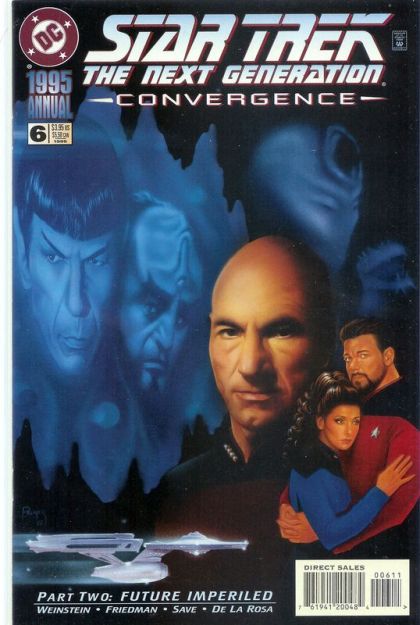 CONVERGENCE - Part 2 of 2, continued from Star Trek (1989 DC 2nd Series) Annual #6. Having caught Captain Spock and Lieutenant Commander Data in a deadly web of temporal genocide, the Devidians continue their plot to destroy the Federation. Now James T. Kirk and Jean-Luc Picard, the Enterprise captains of two centuries, must find a way to rescue their people and stop the Devidians. Written by Michael Jan Friedman and Howard Weinstein, with art by Ken Save and Sam de la Rosa. Both Annuals feature connecting painted covers by Jason Palmer. Cover price $3.95.