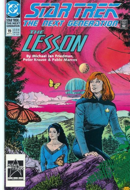 In "The Lesson," a quiet day aboard the Enterprise finds Troi and Dr. Crusher scaling new heights while Wesley and Riker square off over Benedict Arnold. Written by Michael Jan Friedman, with art by Peter Krause and Pablo Marcos. Cover by Jerome Moore. New Format. Cover price $1.50.