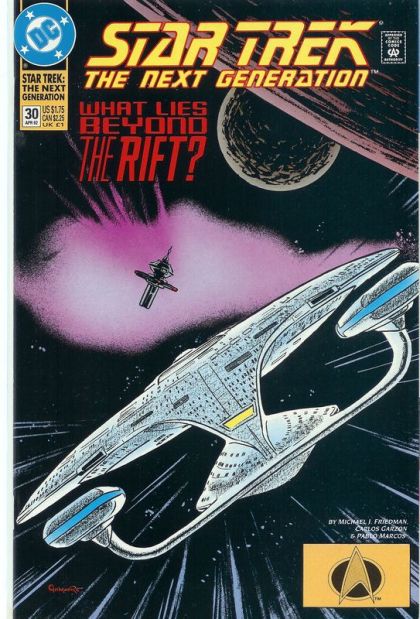 Part 1 of 2. An away team helps evacuate a research station about to get sucked into interdimensional space. Everyone gets away...everyone except Commander Riker. Written by Michael Jan Friedman, with art by Carlos Garzon and Pablo Marcos. Cover by Jerome Moore. New Format. Cover price $1.75.