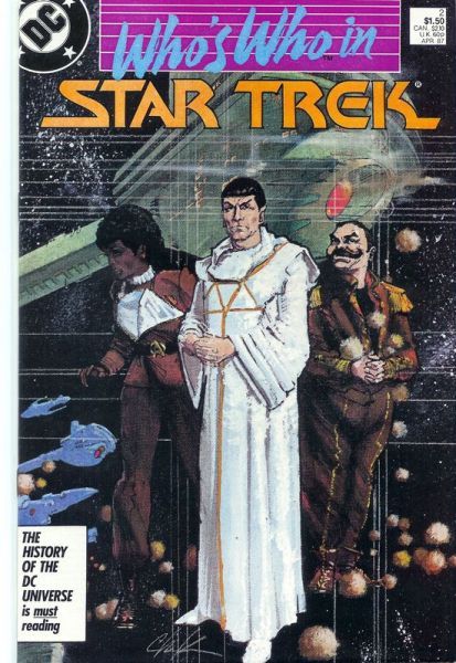 Written and researched by Allan Asherman. Character/artist listing: Marla McGivers by Joe Brozowski and Mike DeCarlo; Melkots by Mike Clark and Greg Brooks; Metrons by Mike Clark and Keith Williams; Miramanee by Michael Bair; Mirror Universe by Ron Frenz and Bruce Patterson; Gary Mitchell by Joe Brozowski and Karl Kesel; Maria Morelli by Curt Swan and Joe Rubinstein; M'Ress by Ken Penders and Romeo Tanghal; Harry Mudd by John Byrne and Terry Austin; Natira by Michael Bair; Number One by Chris Wozniak and Art Nichols; Organians by Murphy Anderson; Orions by Todd McFarlane and Al Gordon; Christopher Pike by Ron Frenz and Bob Smith; Mark Piper by Jonathan Peterson and Romeo Tanghal; Janice Rand by Ron Frenz and Dick Giordano; Redjac by Mark Pacella and Klaus Janson; Kevin Riley by Jan Duursema; Romulans by Walt Simonson; Saavik by Kevin Maguire and Joe Rubinstein; Sarek by John Byrne; Montgomery Scott by Gray Morrow; Gary Seven by George Perez; Areel Shaw by Ken Penders and Dennis Jensen; Elizabeth Sherwood by Curt Swan and Joe Rubinstein; Spock by Tom Sutton and Pablo Marcos; Starbases by Ken Penders and Dennis Jensen; Starfleet and Starfleet Academy by Ken Penders and Danny Bulanadi; Starships by Arne Starr; Hikaru Sulu by Tom Sutton and Pablo Marcos; U.S.S. Surak by Todd McFarlane and Al Gordon; Talosians by Bill Wray; Gillian Taylor by Colleen Doran; Tellarites by Joe Brozowski and Greg Brooks; Tribbles by Michael Carlin and Dick Giordano; Triskelions by Todd McFarlane; Nyota Uhura by Jan Duursema; United Federation of Planets by Art Thibert; Vians by Ken Penders and Dennis Jensen; Vina by Steve Bove; Vulcans by Cynthia Martin. Appendix on inside back cover. Howard Chaykin wraparound cover. Cover price $1.50.