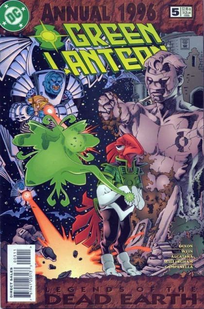 "Nobler in the Mind...!" - El'Qa Sqa Zreenah fights hard against alien attackers, but is seriously wounded. He finds himself crash landed on a world that seems utterly devoid of fearless Green Lantern candidates. The only potential is Perdoo, who seems odd, but is willing to fight the good fight.