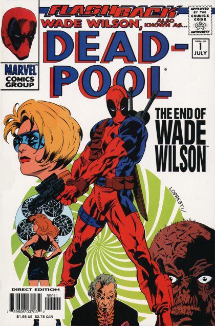Paradigm Lost - Written by Joe Kelly. Art by Aaron Lopresti & Rachel Dodson. Cover pencils by Aaron Lopresti. Flashback! Before he became Deadpool, psycho killer, he was just Wade Wilson, psycho! Want to know when Landau, Luckman & Lake first started observing Wade? Be there for the pivotal moments that led to the creation of the fruitcake we like to call Deadpool! 40 pages, full color. Cover price $1.95.