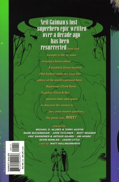 Berlin 1949. The drunken Janos Prohaska and Weng Chan of the Blackhawks go down into a deserted bunker and find some corpses in strange costumes (apparently the Justice Society of America; see second comment) and a strange green lamp (see first comment).Today. Hal Jordan is feeling lonely, and visits Clark Kent for a chat. They accompany each other to a museum convention Clark is supposed to cover for the Daily Planet, and find the green lamp in an exhibition. Hal recognizes it as a power battery, and tries loading his power ring with it. The effect is disastrous and a wave of magic energy kills both heroes. They wind up in the Region of the Just Dead and encounter Deadman, who explains that their deaths are not irrevocable until they have gone "into the light". Hal then tries using his ring to take them back to their bodies, the worst thing he could have done...Meanwhile, the Phantom Stranger sits in the apartment given to him by the Lords of Order, his current masters. Sensing that something else needs his attention, he finally leaves the apartment forever and dismisses the Lords. Now and forever, he is on his own.Superman and Hal have wound up in Hell, where Superman's super-senses can't experience anything but suffering, fear and pain. Horrified by realizing that he can't save these innumerable souls, he is slowly going mad. The cathatonic man of steel can't do anything but float around and cry, while a terrified Green Lantern desperately tries waking him up. When the two of them are attacked by blood-thirsty demons, Hal once again uses his ring, and they disappear.Superman and Green Lantern encounter the power that killed them - the sentient Green Flame, the remains of the magic energies of Maltus. The Green Flame explains that their deaths were a result of Jordan trying to load his scientific ring with supernatural energies. Then it tempts Hal to give in for the supernatural power of the Green Flame instead. At that point, the Stranger appears, and teaches Hal how to tame the corrupt Flame. Hal reads the oath of Alan Scott, loads his ring, and the threat of the Green Flame is neutralized. The Stranger then returns Hal's and Superman's souls to their bodies, disposing of the lamp.Alive after this experience, Hal is feeling better. After a warm good-bye, the two heroes part.