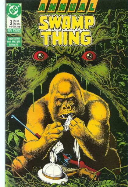 Cover by Brian Bolland. "Distant cousins". Story by Rick Veitch. Pencils by Rick Veitch, Shaun Mcmanus, Jim Fern, and Stan Woch. Inks by Tom Yeates. Monsieur Mallah. Sam Simeon. BWana Beast. Congorilla. Gorilla Boss. Yes, things go ape as Gorilla Grodd takes control of DCs simian characters, causing them to try to free him from imprisonment in Gorilla City. He causes his own problems however when his tampering with nature attracts the attention of the Swamp Thing. 48 pages. Full color. Cover price $2.00.